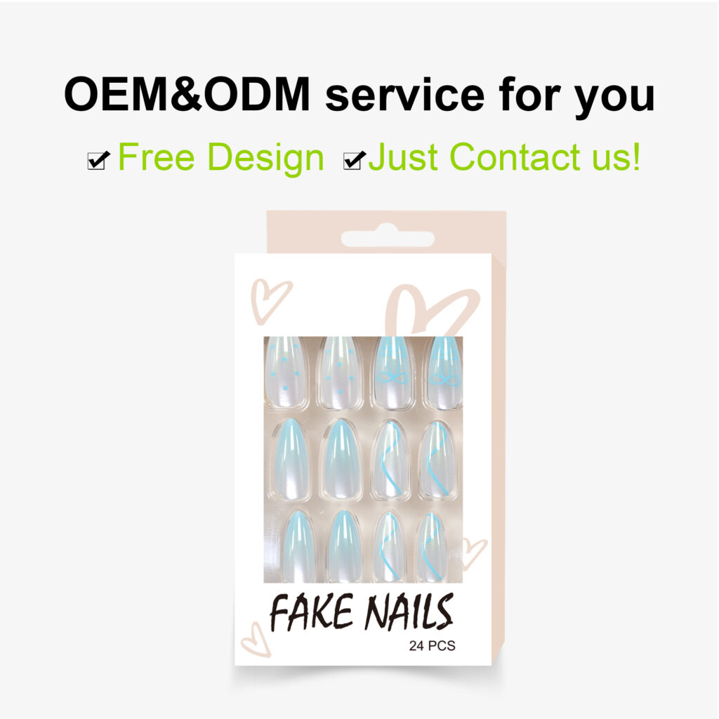 Nailway Wholesale Custom Reusable Light Blue Color Glossy Cat Eye Finger Nails Press On Nails How To Use We are a professional artificial nails OEM supplier with its own factory. The company founded in 2010, located in seaside city Dalian, China. We design and manufacture artificial finger nails, toes nails, kids nails and nails stickers. Committing to provide professional customized solution for brand chain physical stores, large chain supermarket, on line sales and high-end individualized customers all over the word. Such as America, UK, Italy, France, Russia,UAE an so on. We are always making efforts to provide our clients the products in stable quality and guaranteed delivery time service. Our strong production capacity can meet large chain market’s delivery requirements for large order quantities. We warmly welcome customers to come to visit us and doing business together Q:Why Choose Us? Q:Why Choose Us? A:-Our factory has an area of more than 3000 square meters with advanced machines and great team work. Q:What Can We Offer? A:-Best OEM&ODM service,private label is welcome. Q:Can I Get Samples? A:Sure.Free samples are available but shipping cost will be paid for customers, just contact us freely.! Q: What’s The Delivery Time ? A: For customized order, 20-45 days lead time after get the deposit; Q:How About The After-sale Service? A:Please contact our professional salesmen. We will actively solve the problem for you.Description