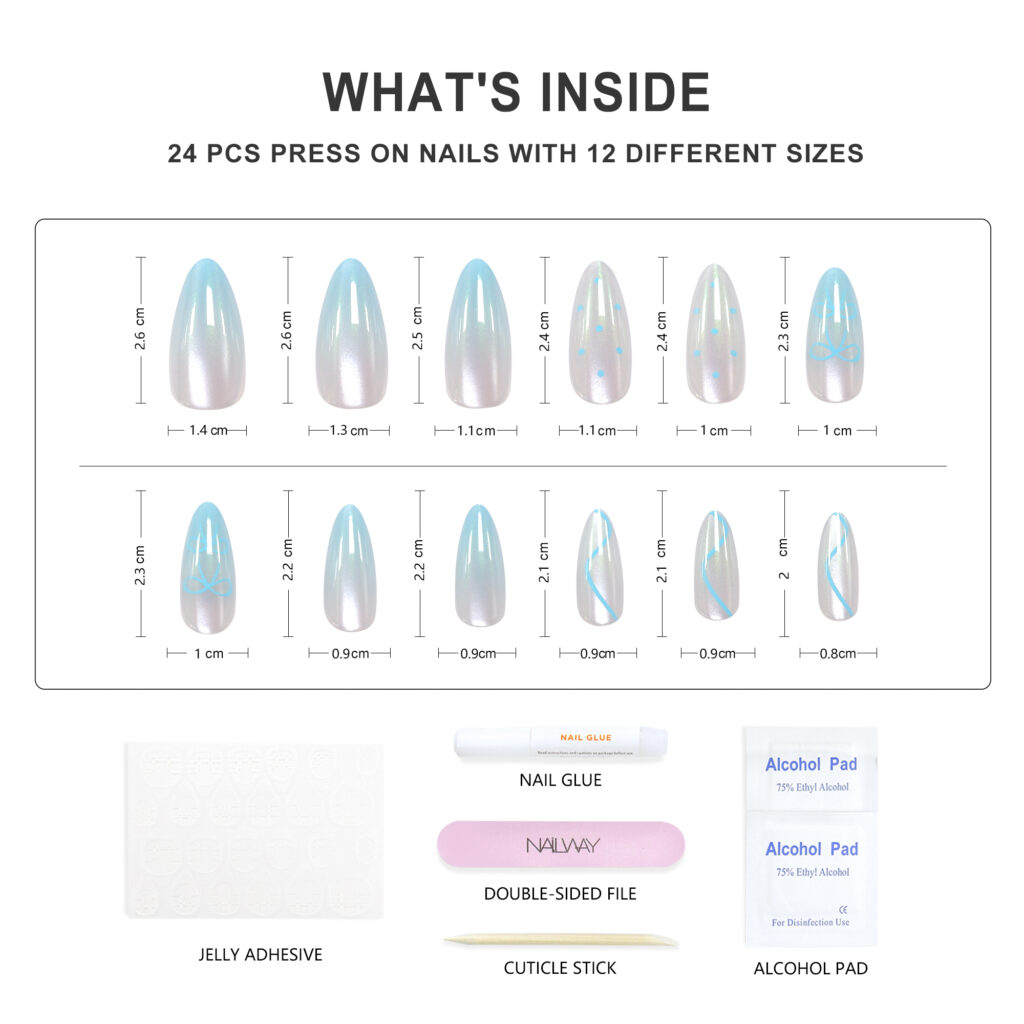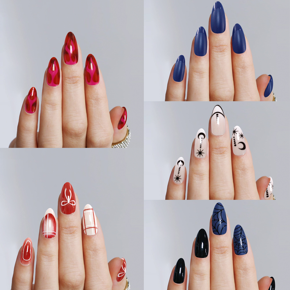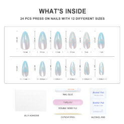 Product Name Fashion Design Glossy Press On Nails Product Type Almond Press On Nails Material High Quality Korea ABS Material Brand Name Nailway OEM/ODM Acceptable Application Fake Nails Size 12Sizes 24Pcs Shape Almond/Stiletto Package Including:24pcs nails + 24pcs glue stickers/nail glue+alcohol pad+stick+nail file. Packed by Nailway box. Delivery Time 3-20days flexible delivery time Features Salon effect, Easy to wear, Removable, Perfect size fitting, 100% No damage to real nails