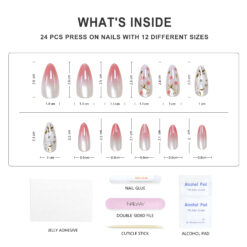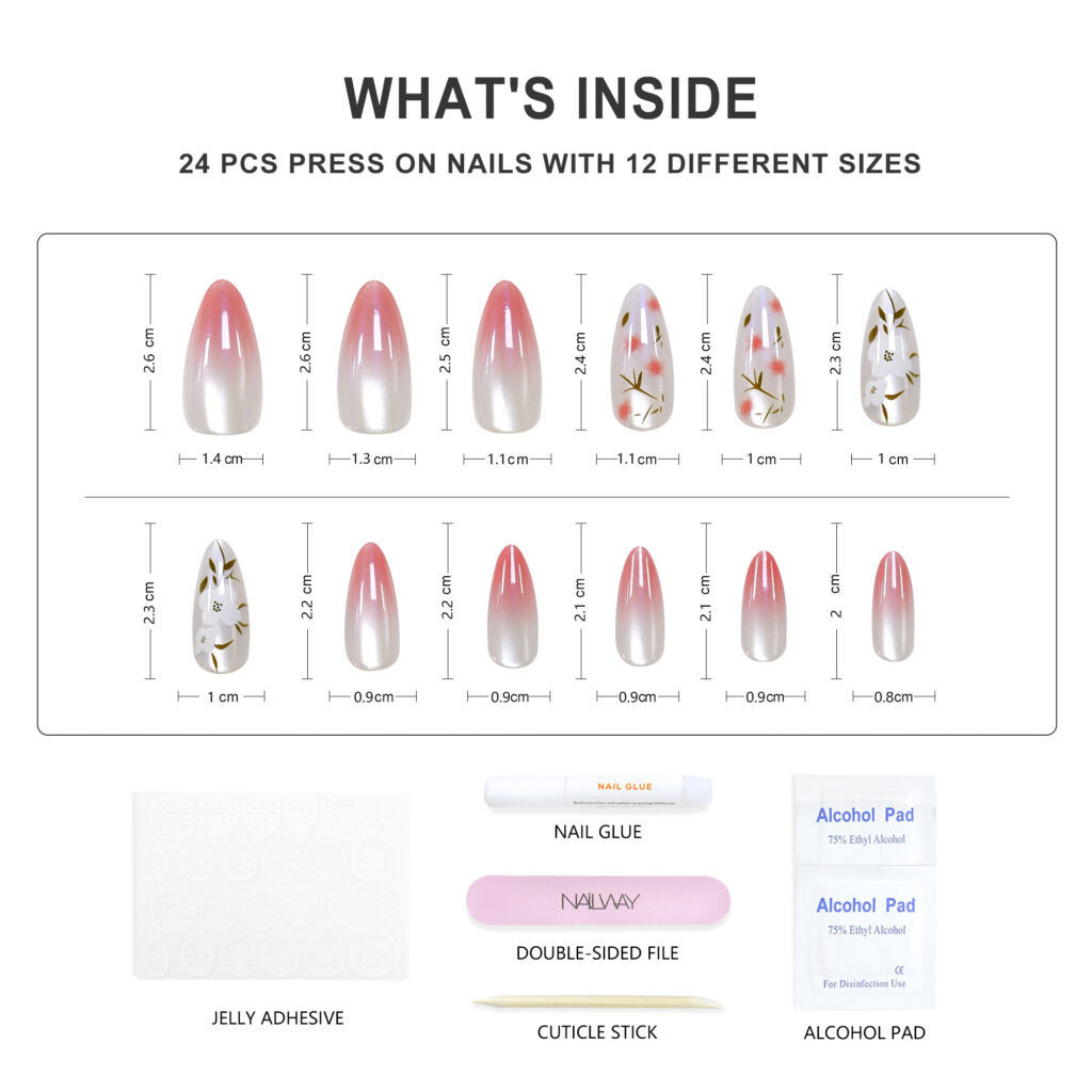 Product Name Fashion Design Glossy Press On Nails Product Type Almond Press On Nails Material High Quality Korea ABS Material Brand Name Nailway OEM/ODM Acceptable Application Fake Nails Size 12Sizes 24Pcs Shape Almond/Stiletto Package Including:24pcs nails + 24pcs glue stickers/nail glue+alcohol pad+stick+nail file. Packed by Nailway box. Delivery Time 3-20days flexible delivery time Features Salon effect, Easy to wear, Removable, Perfect size fitting, 100% No damage to real nails