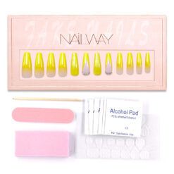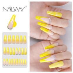 Custom Packaging Box Yellow Color Long Coffin Nails Rhinestones Nail Tips