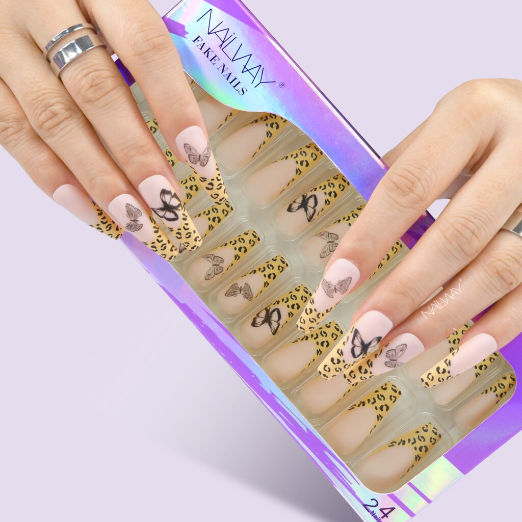 Butterfly Print Long Coffin French Nails Tip Press On Nails