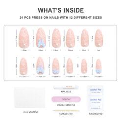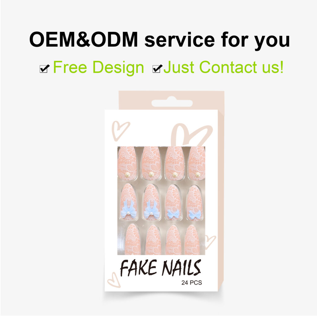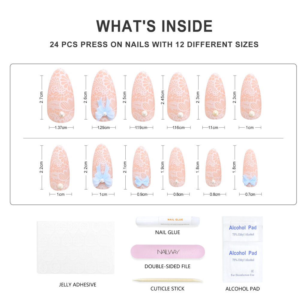 Product Name Press On Nails Product Type Glossy Press On Nails With Bowknot Decoration Material High Quality Korea ABS Material Brand Name Nailway OEM/ODM Acceptable Application Fake Nails Size 12Sizes 24Pcs Shape Almond/Stiletto Package Including:24pcs nails + 24pcs glue stickers/nail glue+alcohol pad+stick+nail file. Packed by Nailway box. Delivery Time 3-20days flexible delivery time Features Salon effect, Easy to wear, Removable, Perfect size fitting, 100% No damage to real nails