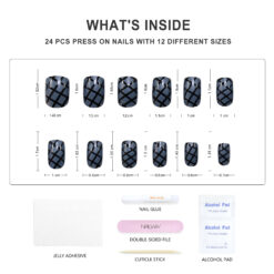 High Quality ABS Material Matte Blue Color Black Stripe Glue On Nails Halloween Design Fake Nails How To Use We are a professional artificial nails OEM supplier with its own factory. The company founded in 2010, located in seaside city Dalian, China. We design and manufacture artificial finger nails, toes nails, kids nails and nails stickers. Committing to provide professional customized solution for brand chain physical stores, large chain supermarket, on line sales and high-end individualized customers all over the word. Such as America, UK, Italy, France, Russia,UAE an so on. We are always making efforts to provide our clients the products in stable quality and guaranteed delivery time service. Our strong production capacity can meet large chain market’s delivery requirements for large order quantities. We warmly welcome customers to come to visit us and doing business together Q:Why Choose Us? Q:Why Choose Us? A:-Our factory has an area of more than 3000 square meters with advanced machines and great team work. Q:What Can We Offer? A:-Best OEM&ODM service,private label is welcome. Q:Can I Get Samples? A:Sure.Free samples are available but shipping cost will be paid for customers, just contact us freely.! Q: What’s The Delivery Time ? A: For customized order, 20-45 days lead time after get the deposit; Q:How About The After-sale Service? A:Please contact our professional salesmen. We will actively solve the problem for you.Description