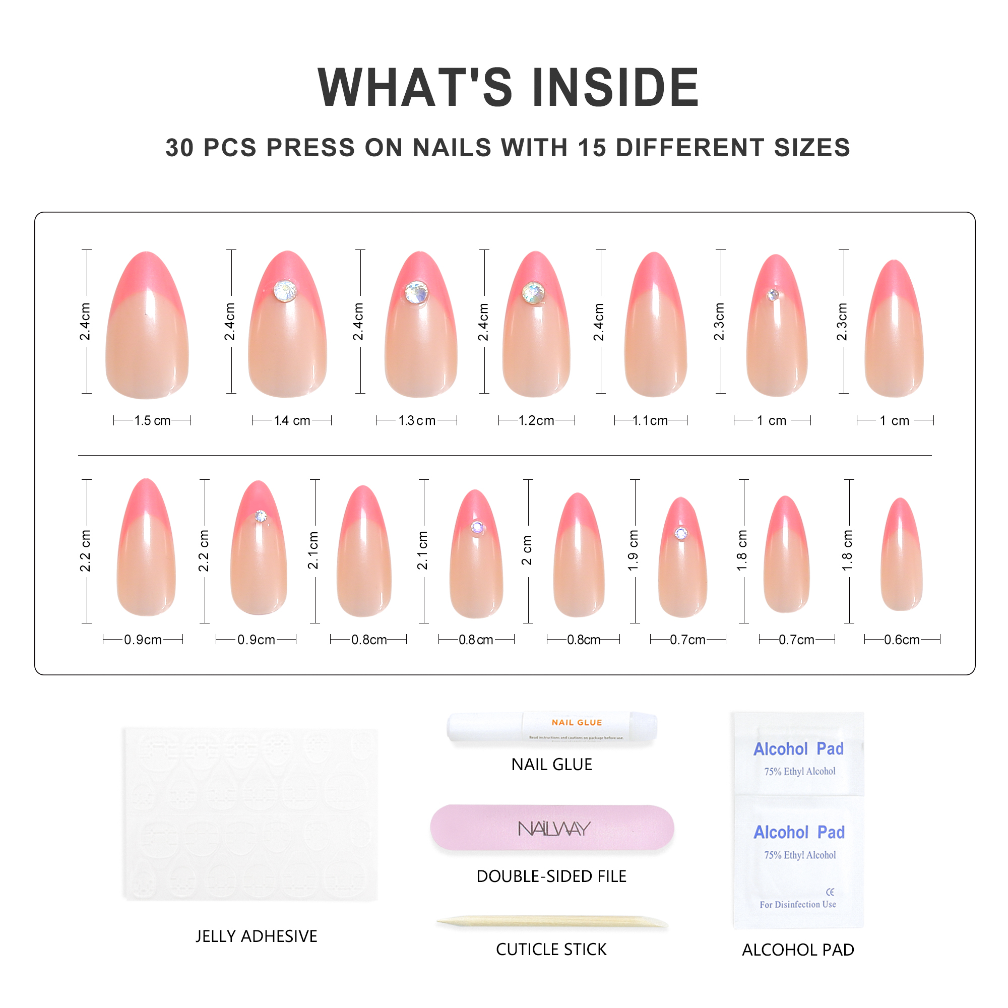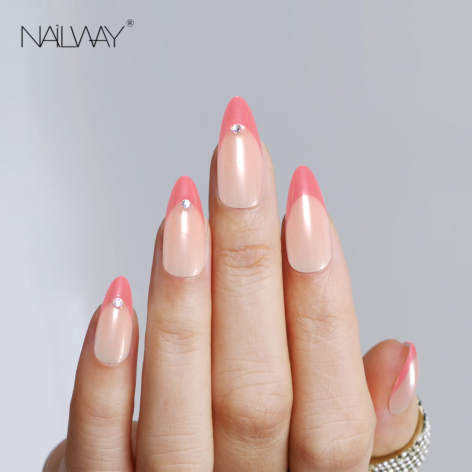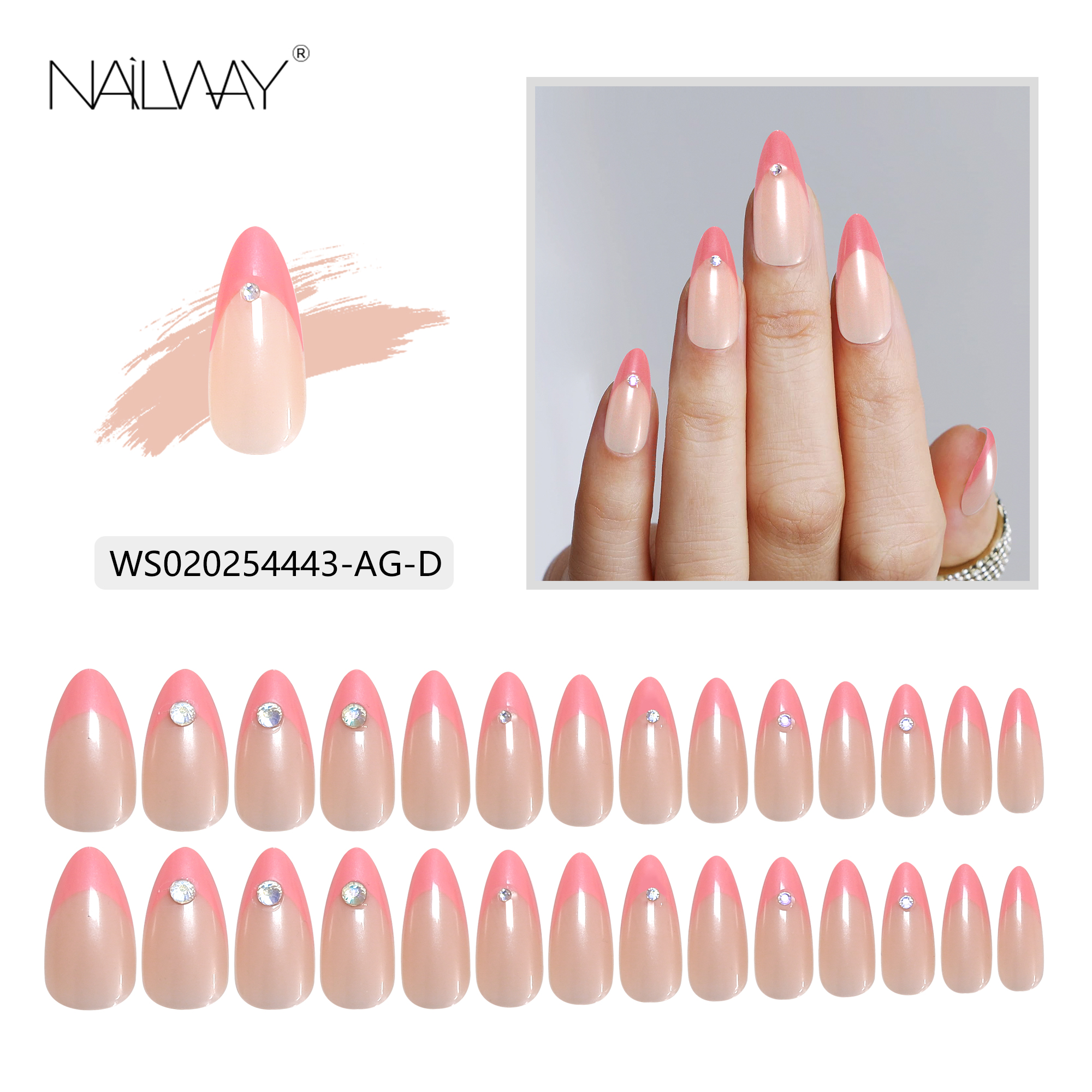 Product Name French Press On Nails Product Type Pink French Tip Press On Nails With Samall Diamond Material High Quality Korea ABS Material Brand Name Nailway OEM/ODM Acceptable Application Fake Nails Size 12Sizes 24Pcs Shape Almond/Stiletto Package Including:24pcs nails + 24pcs glue stickers/nail glue+alcohol pad+stick+nail file. Packed by Nailway box. Delivery Time 3-20days flexible delivery time Features Salon effect, Easy to wear, Removable, Perfect size fitting, 100% No damage to real nails