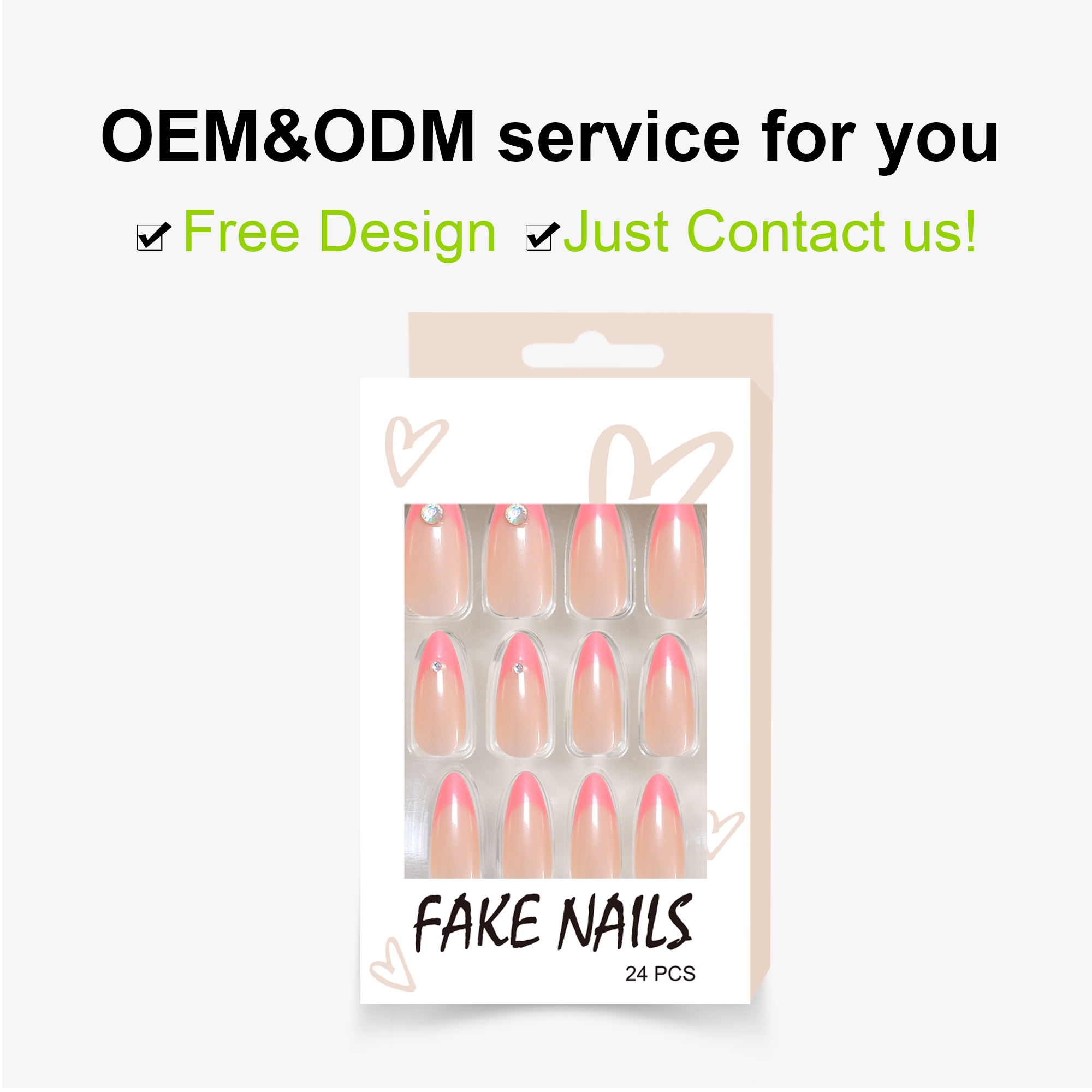 High Quality Glossy 24Pcs 12 Sizes Pink Tip French Press On Nails Artificial Nails How To Use We are a professional artificial nails OEM supplier with its own factory. The company founded in 2010, located in seaside city Dalian, China. We design and manufacture artificial finger nails, toes nails, kids nails and nails stickers. Committing to provide professional customized solution for brand chain physical stores, large chain supermarket, on line sales and high-end individualized customers all over the word. Such as America, UK, Italy, France, Russia,UAE an so on. We are always making efforts to provide our clients the products in stable quality and guaranteed delivery time service. Our strong production capacity can meet large chain market’s delivery requirements for large order quantities. We warmly welcome customers to come to visit us and doing business together Q:Why Choose Us? Q:Why Choose Us? A:-Our factory has an area of more than 3000 square meters with advanced machines and great team work. Q:What Can We Offer? A:-Best OEM&ODM service,private label is welcome. Q:Can I Get Samples? A:Sure.Free samples are available but shipping cost will be paid for customers, just contact us freely.! Q: What’s The Delivery Time ? A: For customized order, 20-45 days lead time after get the deposit; Q:How About The After-sale Service? A:Please contact our professional salesmen. We will actively solve the problem for you.Description