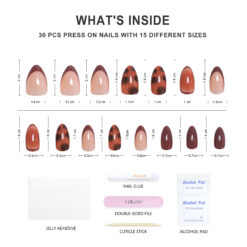 | Package | Including: 30pcs nails + 30pcs glue stickers/nail glue+alcohol pad+stick+nail file. |