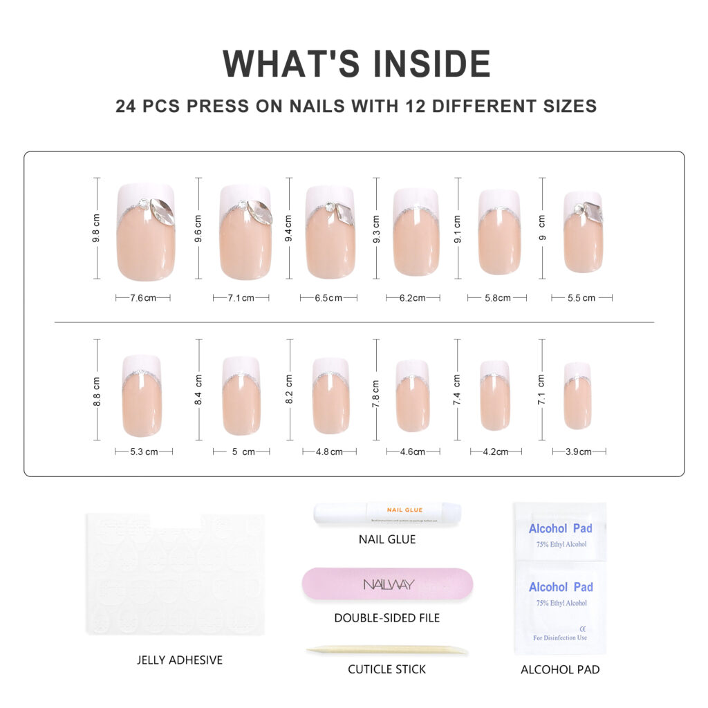 Medium Long Square French Fake Nails White Nail Tip False Nails With Rhinestones How To Use We are a professional artificial nails OEM supplier with its own factory. The company founded in 2010, located in seaside city Dalian, China. We design and manufacture artificial finger nails, toes nails, kids nails and nails stickers. Committing to provide professional customized solution for brand chain physical stores, large chain supermarket, on line sales and high-end individualized customers all over the word. Such as America, UK, Italy, France, Russia,UAE an so on. We are always making efforts to provide our clients the products in stable quality and guaranteed delivery time service. Our strong production capacity can meet large chain market’s delivery requirements for large order quantities. We warmly welcome customers to come to visit us and doing business together Q:Why Choose Us? Q:Why Choose Us? A:-Our factory has an area of more than 3000 square meters with advanced machines and great team work. Q:What Can We Offer? A:-Best OEM&ODM service,private label is welcome. Q:Can I Get Samples? A:Sure.Free samples are available but shipping cost will be paid for customers, just contact us freely.! Q: What’s The Delivery Time ? A: For customized order, 20-45 days lead time after get the deposit; Q:How About The After-sale Service? A:Please contact our professional salesmen. We will actively solve the problem for you.Description