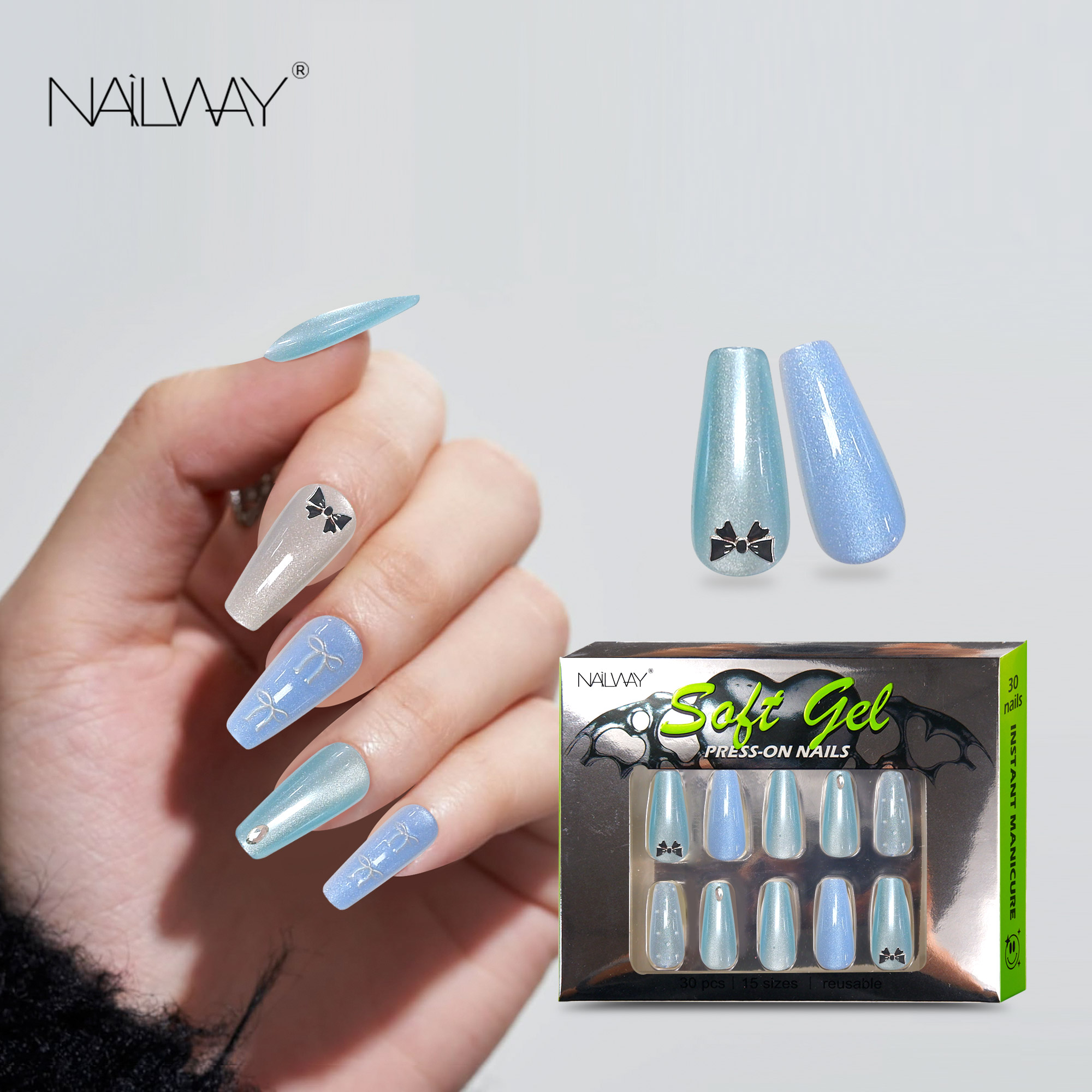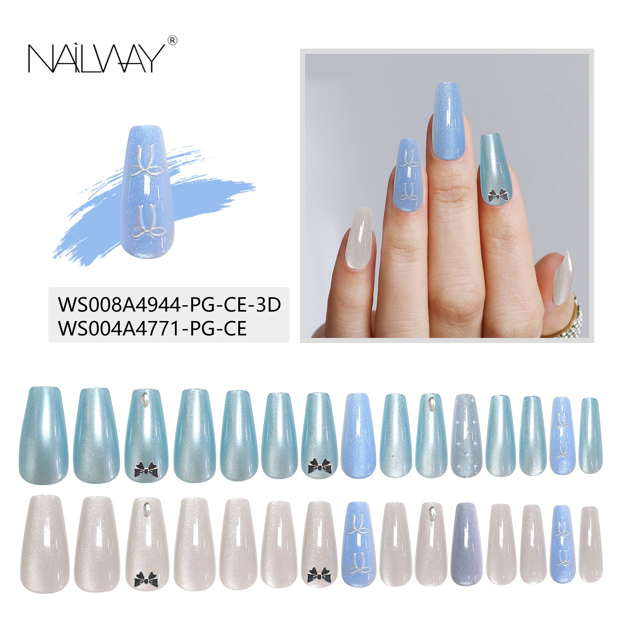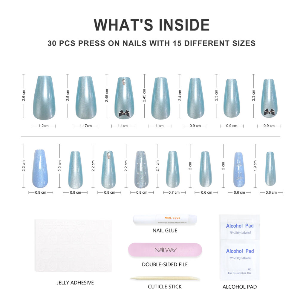 • Nailway 30 Pcs 15 Sizes Long Coffin Shape Cat Eye Light Blue Gel Press On Nails Nailway 30 Pcs 15 Sizes Long Coffin Shape Cat Eye Light Blue Gel Press On Nails