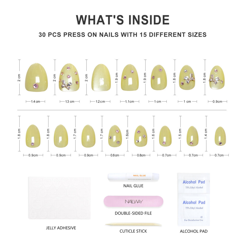 | Package | Including: 30pcs nails + 30pcs glue stickers/nail glue+alcohol pad+stick+nail file. |