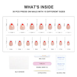 | Package | Including: 30pcs nails + 30pcs glue stickers/nail glue+alcohol pad+stick+nail file. |