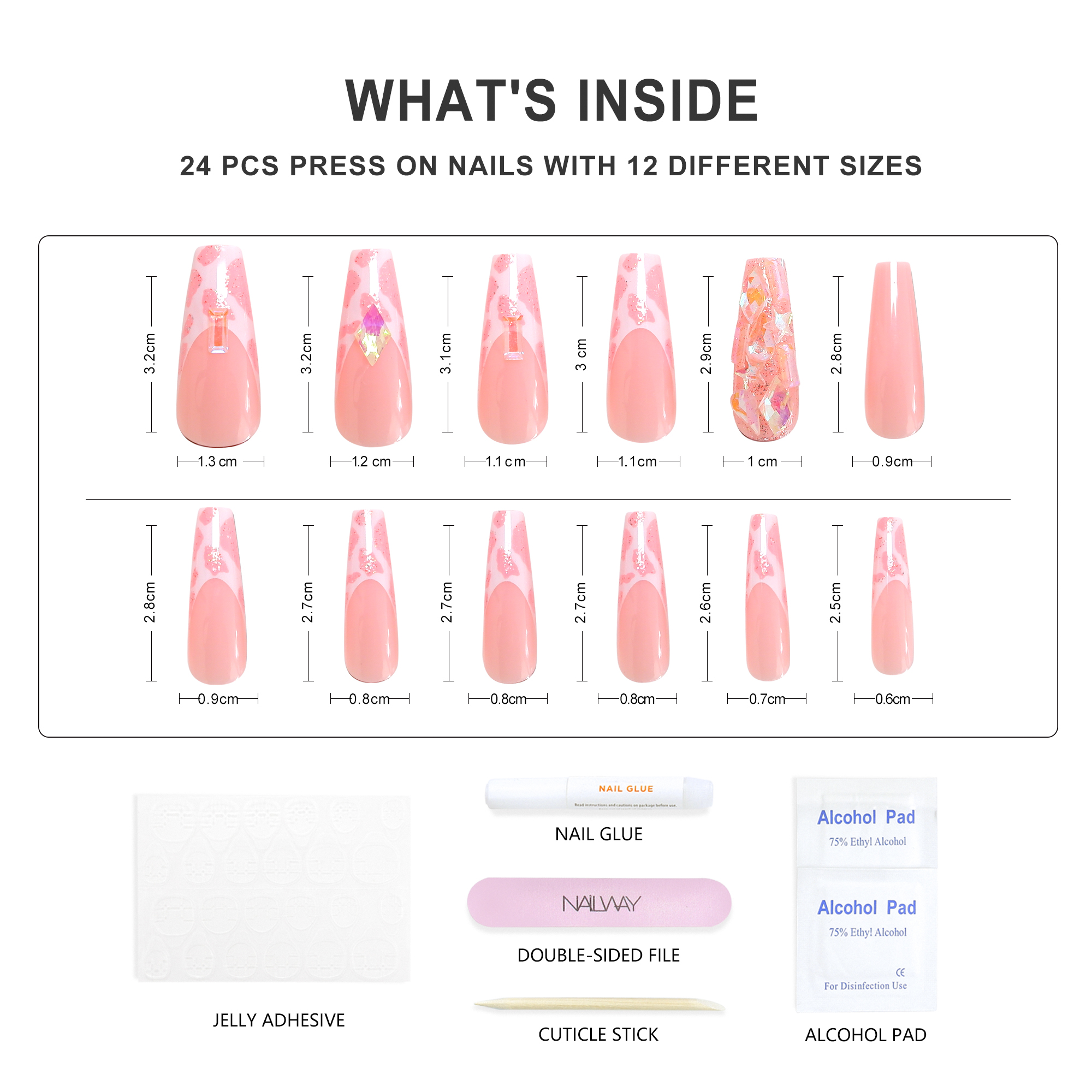 Product Name French Diamond Press On Nails Product Type Glossy French Press On Nails Material High Quality Korea ABS Material Brand Name Nailway OEM/ODM Acceptable Application Fake Nails Size 12Sizes 24Pcs Shape Long Coffin/Ballerina Package Including:24pcs nails + 24pcs glue stickers/nail glue+alcohol pad+stick+nail file. Packed by Nailway box. Delivery Time 3-20days flexible delivery time Features Salon effect, Easy to wear, Removable, Perfect size fitting, 100% No damage to real nails