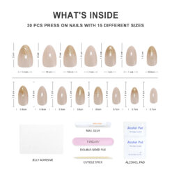 | Package | Including: 30pcs nails + 30pcs glue stickers/nail glue+alcohol pad+stick+nail file. |