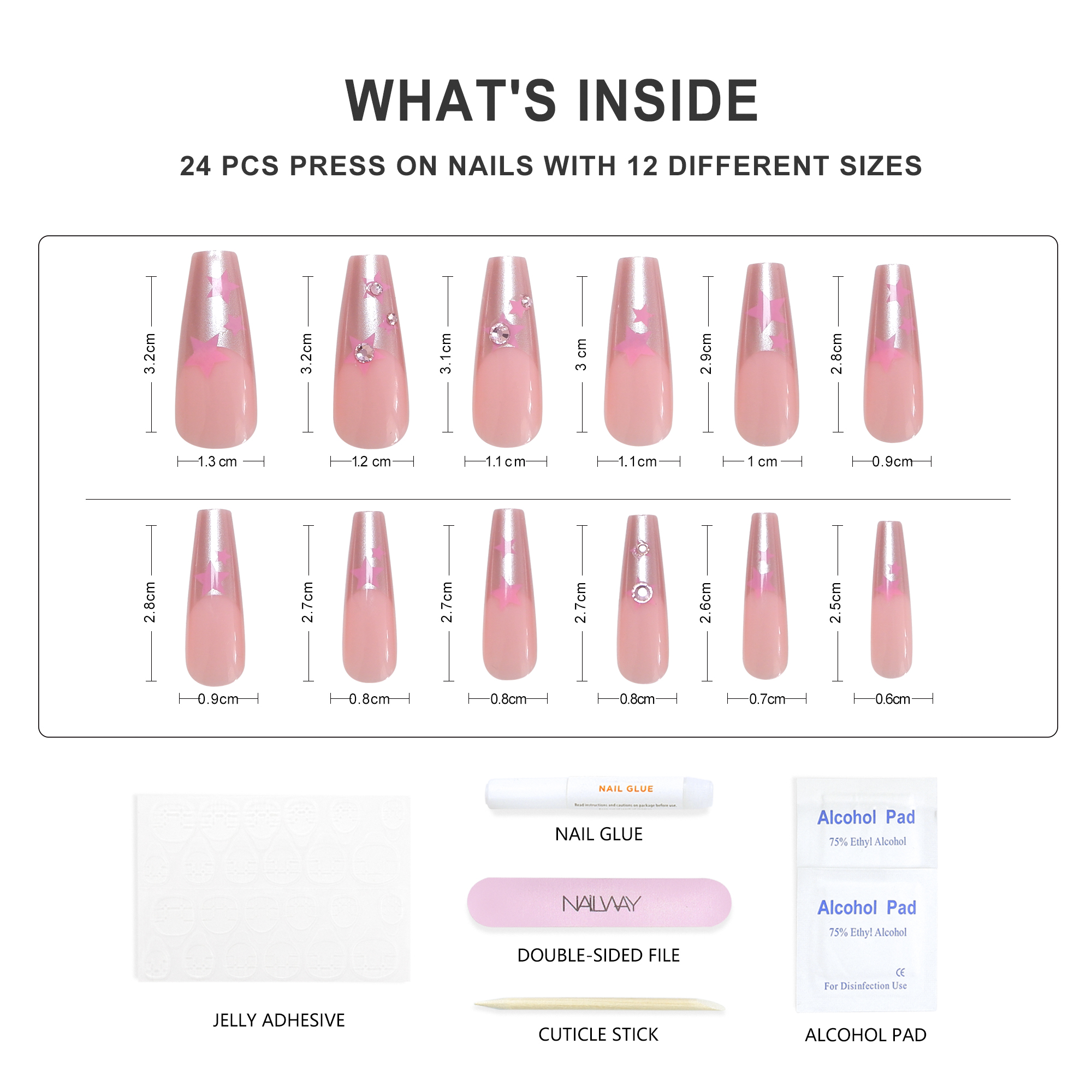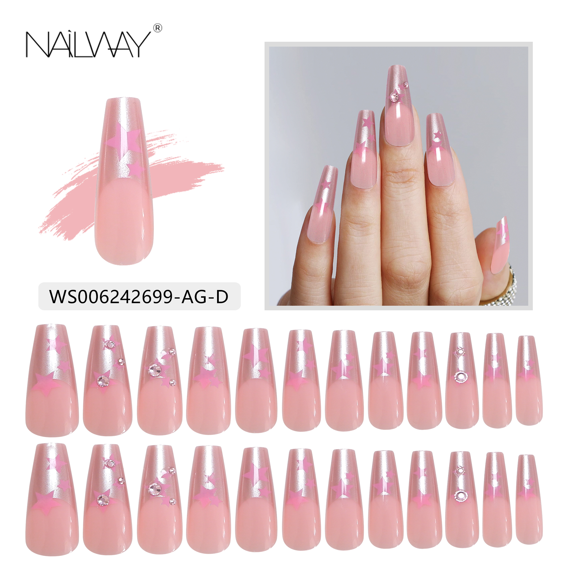 Product Name French Diamond Press On Nails Product Type Glossy French Press On Nails Material High Quality Korea ABS Material Brand Name Nailway OEM/ODM Acceptable Application Fake Nails Size 12Sizes 24Pcs Shape Long Coffin/Ballerina Package Including:24pcs nails + 24pcs glue stickers/nail glue+alcohol pad+stick+nail file. Packed by Nailway box. Delivery Time 3-20days flexible delivery time Features Salon effect, Easy to wear, Removable, Perfect size fitting, 100% No damage to real nails