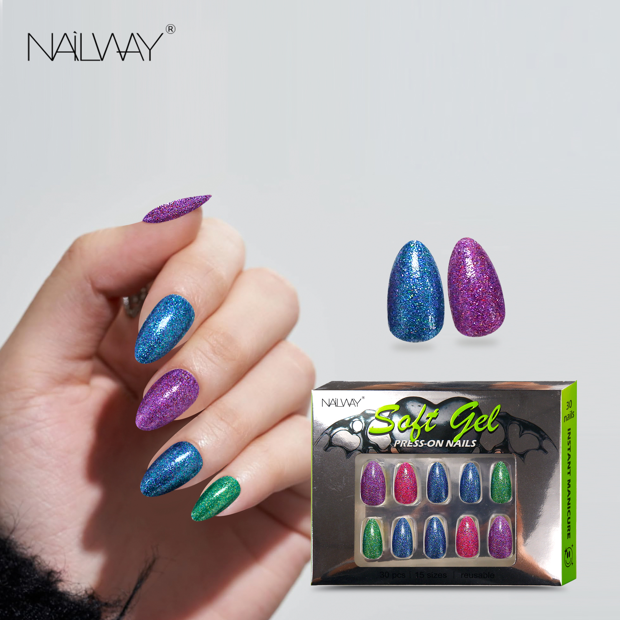 Nailway Instant Manicure Full Cover Long Lasting Time Colorful 30Pcs 15 Sizes Glitter Press On Nails False Nails