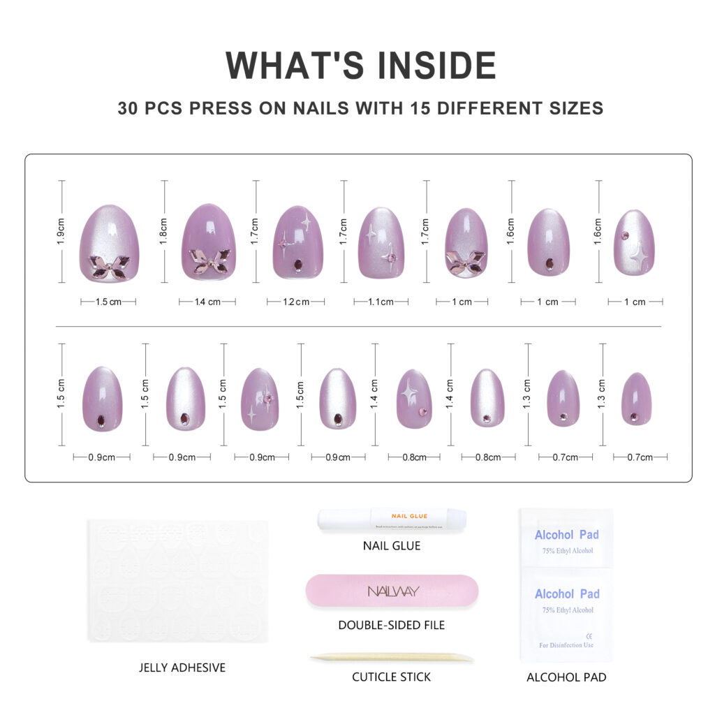 Nailway Short Oval Glossy Cat Eye Purple Color Star Print Soft Gel Diamond Artificial Nails - Image 3
