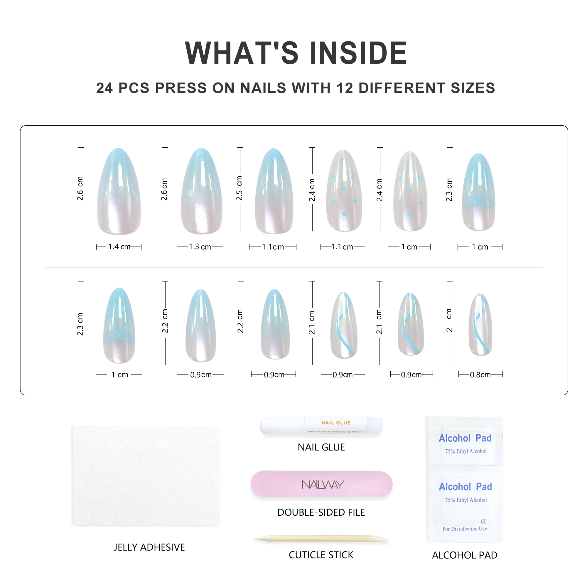 Product Name Fashion Design Glossy Press On Nails Product Type Almond Press On Nails Material High Quality Korea ABS Material Brand Name Nailway OEM/ODM Acceptable Application Fake Nails Size 12Sizes 24Pcs Shape Almond/Stiletto Package Including:24pcs nails + 24pcs glue stickers/nail glue+alcohol pad+stick+nail file. Packed by Nailway box. Delivery Time 3-20days flexible delivery time Features Salon effect, Easy to wear, Removable, Perfect size fitting, 100% No damage to real nails